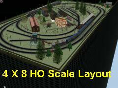 This is a 4' by 8' HO scale layout based on a published track plan. The entire layout uses less than 8 percent of a single baseboard. The layout allows two trains running together and there are sidings and facilities for freight and passenger trains. All tracks are electrified. The model is designed to look like a basic cork-based track layout on a painted wood board.