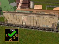 TRS2004 (woodchips and bulk load) and LARS2 industry interactive including rice, wheat, flour, peas, barley, oats, malt, soya beans, hops, and sugar. This Bunge Corporation car is a 54ft Covered 3-bay Hopper and was created with Paint Shed and Jasc Paint Shop Pro using the Auran's alias car.