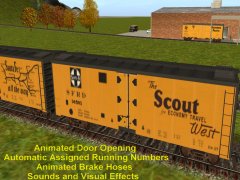 Accommodates CMTMSystem3 car destination system. WARNING! Huge number of product dependencies. This 40ft reefer employees random assigned running numbers and animated air brake hoses with sound, small dust cloud with door openning. RPearson's gs script file for this car is a brillant piece of work and what really makes this animated reefer perform. He can not be thanked enough. Thanks also to Eldavo for the NumberIT library. Thanks also to Madeline Usher whose LODI Loading Direction Indicator is superb and provides the trigger to instruct the car to animate the door opening at older industries, like the Hyde Pulp Mill and the B1 Industry when loading general goods, etc. Please note that car may not animate at all industry load and unload locations. See the ReadmeDoor.txt file for additional information. Many thanks to the creators of the dependency items particularly msgsapper and llj. Created with Gmax, Blender and Jasc Paint Shop Pro