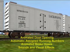 Accommodates CMTMSystem3 car destination system. WARNING! Huge number of product dependencies. This 40ft reefer employees random assigned running numbers and animated air brake hoses with sound, small dust cloud with door openning. RPearson's gs script file for this car is a brillant piece of work and what really makes this animated reefer perform. He can not be thanked enough. Thanks also to Eldavo for the NumberIT library. Thanks also to Madeline Usher whose LODI Loading Direction Indicator is superb and provides the trigger to instruct the car to animate the door opening at older industries, like the Hyde Pulp Mill and the B1 Industry when loading general goods, etc. Please note that car may not animate at all industry load and unload locations. See the ReadmeDoor.txt file for additional information. Many thanks to the creators of the dependency items particularly msgsapper and llj. Created with Gmax, Blender and Jasc Paint Shop Pro