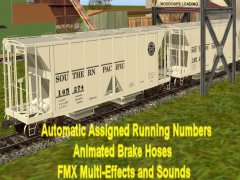 Accommodates CMTMSystem3 car destination system. Chicken Neck Foundry presents an animated 8 top hatch 2-Bay open side Covered Hopper with automatic assigned running numbers (thanks eldavo) and animated air brake hoses (thanks Wulf_9). The 8 top hatches open and close with load and unload sounds and dust flying at facilities like woodchips and interactive industries. Dust bellows from under the bays as the hopperunloads. Thanks bsnteng for fantastic assistance in editing hopper.gs script for automatic running numbers, brake air hoses, and couplers, and also thanks to Pencil42 aka Chris for fantastic assistance in editing previous hopper.gs script for the dust clouds at loading docks. . Thanks to Fitz505 for his prior assistance on hatch animation. Car has brake cylinders and couplers (thanks prjindigo) too. See more action and dust clouds loading at Auran industries. Created from the rails up with gmax Trainz Asset Creation Studio. Loads LARS and Auran products: barley, cement, corn, flour, grain hp, lose gravel, hops, limestone aggregate, malt, oats, peas, plaster, granular plastic, quartz sand, rice, sand, sand and gravel, soda ash, soya beans, sugar, taconite pellets, wheat, or woodchips. Employees cloakedghost275 bogies.
