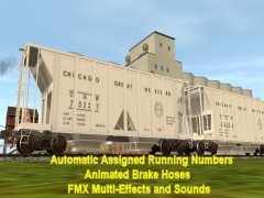 Accommodates CMTMSystem3 car destination system. Chicken Neck Foundry presents an animated 8 top hatch 2-Bay open side Covered Hopper with automatic assigned running numbers (thanks eldavo) and animated air brake hoses (thanks Wulf_9). The 8 top hatches open and close with load and unload sounds and dust flying at facilities like woodchips and interactive industries. Dust bellows from under the bays as the hopperunloads. Thanks bsnteng for fantastic assistance in editing hopper.gs script for automatic running numbers, brake air hoses, and couplers, and also thanks to Pencil42 aka Chris for fantastic assistance in editing previous hopper.gs script for the dust clouds at loading docks. . Thanks to Fitz505 for his prior assistance on hatch animation. Car has brake cylinders and couplers (thanks prjindigo) too. See more action and dust clouds loading at Auran industries. Created from the rails up with gmax Trainz Asset Creation Studio. Loads LARS and Auran products: barley, cement, corn, flour, grain hp, lose gravel, hops, limestone aggregate, malt, oats, peas, plaster, granular plastic, quartz sand, rice, sand, sand and gravel, soda ash, soya beans, sugar, taconite pellets, wheat, or woodchips. Employees cloakedghost275 bogies.