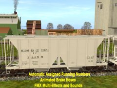 Accommodates CMTMSystem3 car destination system. Chicken Neck Foundry presents an animated 8 top hatch 2-Bay open side Covered Hopper with automatic assigned running numbers (thanks eldavo) and animated air brake hoses (thanks Wulf_9). The 8 top hatches open and close with load and unload sounds and dust flying at facilities like woodchips and interactive industries. Dust bellows from under the bays as the hopperunloads. Thanks bsnteng for fantastic assistance in editing hopper.gs script for automatic running numbers, brake air hoses, and couplers, and also thanks to Pencil42 aka Chris for fantastic assistance in editing previous hopper.gs script for the dust clouds at loading docks. . Thanks to Fitz505 for his prior assistance on hatch animation. Car has brake cylinders and couplers (thanks prjindigo) too. See more action and dust clouds loading at Auran industries. Created from the rails up with gmax Trainz Asset Creation Studio. Loads LARS and Auran products: barley, cement, corn, flour, grain hp, lose gravel, hops, limestone aggregate, malt, oats, peas, plaster, granular plastic, quartz sand, rice, sand, sand and gravel, soda ash, soya beans, sugar, taconite pellets, wheat, or woodchips. Employees cloakedghost275 bogies.
