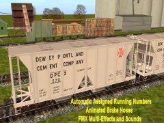 Accommodates CMTMSystem3 car destination system. Chicken Neck Foundry presents an animated 8 top hatch 2-Bay open side Covered Hopper with automatic assigned running numbers (thanks eldavo) and animated air brake hoses (thanks Wulf_9). The 8 top hatches open and close with load and unload sounds and dust flying at facilities like woodchips and interactive industries. Dust bellows from under the bays as the hopperunloads. Thanks bsnteng for fantastic assistance in editing hopper.gs script for automatic running numbers, brake air hoses, and couplers, and also thanks to Pencil42 aka Chris for fantastic assistance in editing previous hopper.gs script for the dust clouds at loading docks. . Thanks to Fitz505 for his prior assistance on hatch animation. Car has brake cylinders and couplers (thanks prjindigo) too. See more action and dust clouds loading at Auran industries. Created from the rails up with gmax Trainz Asset Creation Studio. Loads LARS and Auran products: barley, cement, corn, flour, grain hp, lose gravel, hops, limestone aggregate, malt, oats, peas, plaster, granular plastic, quartz sand, rice, sand, sand and gravel, soda ash, soya beans, sugar, taconite pellets, wheat, or woodchips. Employees cloakedghost275 bogies.