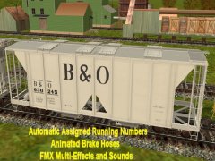 Accommodates CMTMSystem3 car destination system. Chicken Neck Foundry presents an animated 8 top hatch 2-Bay open side Covered Hopper with automatic assigned running numbers (thanks eldavo) and animated air brake hoses (thanks Wulf_9). The 8 top hatches open and close with load and unload sounds and dust flying at facilities like woodchips and interactive industries. Dust bellows from under the bays as the hopperunloads. Thanks bsnteng for fantastic assistance in editing hopper.gs script for automatic running numbers, brake air hoses, and couplers, and also thanks to Pencil42 aka Chris for fantastic assistance in editing previous hopper.gs script for the dust clouds at loading docks. . Thanks to Fitz505 for his prior assistance on hatch animation. Car has brake cylinders and couplers (thanks prjindigo) too. See more action and dust clouds loading at Auran industries. Created from the rails up with gmax Trainz Asset Creation Studio. Loads LARS and Auran products: barley, cement, corn, flour, grain hp, lose gravel, hops, limestone aggregate, malt, oats, peas, plaster, granular plastic, quartz sand, rice, sand, sand and gravel, soda ash, soya beans, sugar, taconite pellets, wheat, or woodchips. Employees cloakedghost275 bogies.