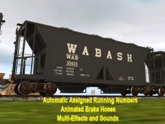 Accommodates CMTMSystem3 car destination system. Chicken Neck Foundry presents an animated 8 top hatch 2-Bay open side Covered Hopper with automatic assigned running numbers (thanks eldavo) and animated air brake hoses (thanks Wulf_9). The 8 top hatches open and close with load and unload sounds and dust flying at facilities like woodchips and interactive industries. Dust bellows from under the bays as the hopperunloads. Thanks bsnteng for fantastic assistance in editing hopper.gs script for automatic running numbers, brake air hoses, and couplers, and also thanks to Pencil42 aka Chris for fantastic assistance in editing previous hopper.gs script for the dust clouds at loading docks. . Thanks to Fitz505 for his prior assistance on hatch animation. Car has brake cylinders and couplers (thanks prjindigo) too. See more action and dust clouds loading at Auran industries. Created from the rails up with gmax Trainz Asset Creation Studio. Loads LARS and Auran products: barley, cement, corn, flour, grain hp, lose gravel, hops, limestone aggregate, malt, oats, peas, plaster, granular plastic, quartz sand, rice, sand, sand and gravel, soda ash, soya beans, sugar, taconite pellets, wheat, or woodchips. Employees cloakedghost275 bogies.