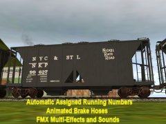 Accommodates CMTMSystem3 car destination system. Chicken Neck Foundry presents an animated 8 top hatch 2-Bay open side Covered Hopper with automatic assigned running numbers (thanks eldavo) and animated air brake hoses (thanks Wulf_9). The 8 top hatches open and close with load and unload sounds and dust flying at facilities like woodchips and interactive industries. Dust bellows from under the bays as the hopperunloads. Thanks bsnteng for fantastic assistance in editing hopper.gs script for automatic running numbers, brake air hoses, and couplers, and also thanks to Pencil42 aka Chris for fantastic assistance in editing previous hopper.gs script for the dust clouds at loading docks. . Thanks to Fitz505 for his prior assistance on hatch animation. Car has brake cylinders and couplers (thanks prjindigo) too. See more action and dust clouds loading at Auran industries. Created from the rails up with gmax Trainz Asset Creation Studio. Loads LARS and Auran products: barley, cement, corn, flour, grain hp, lose gravel, hops, limestone aggregate, malt, oats, peas, plaster, granular plastic, quartz sand, rice, sand, sand and gravel, soda ash, soya beans, sugar, taconite pellets, wheat, or woodchips. Employees cloakedghost275 bogies.
