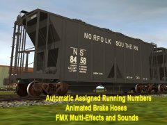 Accommodates CMTMSystem3 car destination system. Chicken Neck Foundry presents an animated 8 top hatch 2-Bay open side Covered Hopper with automatic assigned running numbers (thanks eldavo) and animated air brake hoses (thanks Wulf_9). The 8 top hatches open and close with load and unload sounds and dust flying at facilities like woodchips and interactive industries. Dust bellows from under the bays as the hopperunloads. Thanks bsnteng for fantastic assistance in editing hopper.gs script for automatic running numbers, brake air hoses, and couplers, and also thanks to Pencil42 aka Chris for fantastic assistance in editing previous hopper.gs script for the dust clouds at loading docks. . Thanks to Fitz505 for his prior assistance on hatch animation. Car has brake cylinders and couplers (thanks prjindigo) too. See more action and dust clouds loading at Auran industries. Created from the rails up with gmax Trainz Asset Creation Studio. Loads LARS and Auran products: barley, cement, corn, flour, grain hp, lose gravel, hops, limestone aggregate, malt, oats, peas, plaster, granular plastic, quartz sand, rice, sand, sand and gravel, soda ash, soya beans, sugar, taconite pellets, wheat, or woodchips. Employees cloakedghost275 bogies.