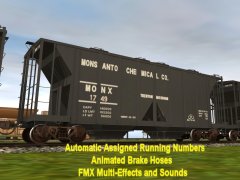 Accommodates CMTMSystem3 car destination system. Chicken Neck Foundry presents an animated 8 top hatch 2-Bay open side Covered Hopper with automatic assigned running numbers (thanks eldavo) and animated air brake hoses (thanks Wulf_9). The 8 top hatches open and close with load and unload sounds and dust flying at facilities like woodchips and interactive industries. Dust bellows from under the bays as the hopperunloads. Thanks bsnteng for fantastic assistance in editing hopper.gs script for automatic running numbers, brake air hoses, and couplers, and also thanks to Pencil42 aka Chris for fantastic assistance in editing previous hopper.gs script for the dust clouds at loading docks. . Thanks to Fitz505 for his prior assistance on hatch animation. Car has brake cylinders and couplers (thanks prjindigo) too. See more action and dust clouds loading at Auran industries. Created from the rails up with gmax Trainz Asset Creation Studio. Loads LARS and Auran products: barley, cement, corn, flour, grain hp, lose gravel, hops, limestone aggregate, malt, oats, peas, plaster, granular plastic, quartz sand, rice, sand, sand and gravel, soda ash, soya beans, sugar, taconite pellets, wheat, or woodchips. Employees cloakedghost275 bogies.