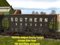 Accommodates CMTMSystem3 car destination system. Chicken Neck Foundry presents an animated 8 top hatch 2-Bay open side Covered Hopper with automatic assigned running numbers (thanks eldavo) and animated air brake hoses (thanks Wulf_9). The 8 top hatches open and close with load and unload sounds and dust flying at facilities like woodchips and interactive industries. Dust bellows from under the bays as the hopperunloads. Thanks bsnteng for fantastic assistance in editing hopper.gs script for automatic running numbers, brake air hoses, and couplers, and also thanks to Pencil42 aka Chris for fantastic assistance in editing previous hopper.gs script for the dust clouds at loading docks. . Thanks to Fitz505 for his prior assistance on hatch animation. Car has brake cylinders and couplers (thanks prjindigo) too. See more action and dust clouds loading at Auran industries. Created from the rails up with gmax Trainz Asset Creation Studio. Loads LARS and Auran products: barley, cement, corn, flour, grain hp, lose gravel, hops, limestone aggregate, malt, oats, peas, plaster, granular plastic, quartz sand, rice, sand, sand and gravel, soda ash, soya beans, sugar, taconite pellets, wheat, or woodchips. Employees cloakedghost275 bogies.