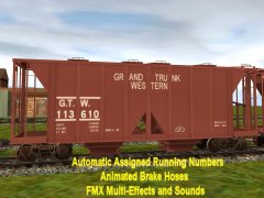 Accommodates CMTMSystem3 car destination system. Chicken Neck Foundry presents an animated 8 top hatch 2-Bay open side Covered Hopper with automatic assigned running numbers (thanks eldavo) and animated air brake hoses (thanks Wulf_9). The 8 top hatches open and close with load and unload sounds and dust flying at facilities like woodchips and interactive industries. Dust bellows from under the bays as the hopperunloads. Thanks bsnteng for fantastic assistance in editing hopper.gs script for automatic running numbers, brake air hoses, and couplers, and also thanks to Pencil42 aka Chris for fantastic assistance in editing previous hopper.gs script for the dust clouds at loading docks. . Thanks to Fitz505 for his prior assistance on hatch animation. Car has brake cylinders and couplers (thanks prjindigo) too. See more action and dust clouds loading at Auran industries. Created from the rails up with gmax Trainz Asset Creation Studio. Loads LARS and Auran products: barley, cement, corn, flour, grain hp, lose gravel, hops, limestone aggregate, malt, oats, peas, plaster, granular plastic, quartz sand, rice, sand, sand and gravel, soda ash, soya beans, sugar, taconite pellets, wheat, or woodchips. Employees cloakedghost275 bogies.