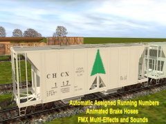 Accommodates CMTMSystem3 car destination system. Chicken Neck Foundry presents an animated 8 top hatch 2-Bay open side Covered Hopper with automatic assigned running numbers (thanks eldavo) and animated air brake hoses (thanks Wulf_9). The 8 top hatches open and close with load and unload sounds and dust flying at facilities like woodchips and interactive industries. Dust bellows from under the bays as the hopperunloads. Thanks bsnteng for fantastic assistance in editing hopper.gs script for automatic running numbers, brake air hoses, and couplers, and also thanks to Pencil42 aka Chris for fantastic assistance in editing previous hopper.gs script for the dust clouds at loading docks. . Thanks to Fitz505 for his prior assistance on hatch animation. Car has brake cylinders and couplers (thanks prjindigo) too. See more action and dust clouds loading at Auran industries. Created from the rails up with gmax Trainz Asset Creation Studio. Loads LARS and Auran products: barley, cement, corn, flour, grain hp, lose gravel, hops, limestone aggregate, malt, oats, peas, plaster, granular plastic, quartz sand, rice, sand, sand and gravel, soda ash, soya beans, sugar, taconite pellets, wheat, or woodchips. Employees cloakedghost275 bogies.