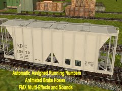 Accommodates CMTMSystem3 car destination system. Chicken Neck Foundry presents an animated 8 top hatch 2-Bay open side Covered Hopper with automatic assigned running numbers (thanks eldavo) and animated air brake hoses (thanks Wulf_9). The 8 top hatches open and close with load and unload sounds and dust flying at facilities like woodchips and interactive industries. Dust bellows from under the bays as the hopperunloads. Thanks bsnteng for fantastic assistance in editing hopper.gs script for automatic running numbers, brake air hoses, and couplers, and also thanks to Pencil42 aka Chris for fantastic assistance in editing previous hopper.gs script for the dust clouds at loading docks. . Thanks to Fitz505 for his prior assistance on hatch animation. Car has brake cylinders and couplers (thanks prjindigo) too. See more action and dust clouds loading at Auran industries. Created from the rails up with gmax Trainz Asset Creation Studio. Loads LARS and Auran products: barley, cement, corn, flour, grain hp, lose gravel, hops, limestone aggregate, malt, oats, peas, plaster, granular plastic, quartz sand, rice, sand, sand and gravel, soda ash, soya beans, sugar, taconite pellets, wheat, or woodchips. Employees cloakedghost275 bogies.