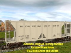 Accommodates CMTMSystem3 car destination system. Chicken Neck Foundry presents an animated 8 top hatch 2-Bay open side Covered Hopper with automatic assigned running numbers (thanks eldavo) and animated air brake hoses (thanks Wulf_9). The 8 top hatches open and close with load and unload sounds and dust flying at facilities like woodchips and interactive industries. Dust bellows from under the bays as the hopperunloads. Thanks bsnteng for fantastic assistance in editing hopper.gs script for automatic running numbers, brake air hoses, and couplers, and also thanks to Pencil42 aka Chris for fantastic assistance in editing previous hopper.gs script for the dust clouds at loading docks. . Thanks to Fitz505 for his prior assistance on hatch animation. Car has brake cylinders and couplers (thanks prjindigo) too. See more action and dust clouds loading at Auran industries. Created from the rails up with gmax Trainz Asset Creation Studio. Loads LARS and Auran products: barley, cement, corn, flour, grain hp, lose gravel, hops, limestone aggregate, malt, oats, peas, plaster, granular plastic, quartz sand, rice, sand, sand and gravel, soda ash, soya beans, sugar, taconite pellets, wheat, or woodchips. Employees cloakedghost275 bogies.