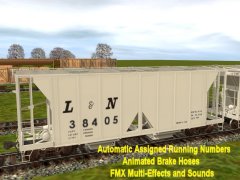 Accommodates CMTMSystem3 car destination system. Chicken Neck Foundry presents an animated 8 top hatch 2-Bay open side Covered Hopper with automatic assigned running numbers (thanks eldavo) and animated air brake hoses (thanks Wulf_9). The 8 top hatches open and close with load and unload sounds and dust flying at facilities like woodchips and interactive industries. Dust bellows from under the bays as the hopperunloads. Thanks bsnteng for fantastic assistance in editing hopper.gs script for automatic running numbers, brake air hoses, and couplers, and also thanks to Pencil42 aka Chris for fantastic assistance in editing previous hopper.gs script for the dust clouds at loading docks. . Thanks to Fitz505 for his prior assistance on hatch animation. Car has brake cylinders and couplers (thanks prjindigo) too. See more action and dust clouds loading at Auran industries. Created from the rails up with gmax Trainz Asset Creation Studio. Loads LARS and Auran products: barley, cement, corn, flour, grain hp, lose gravel, hops, limestone aggregate, malt, oats, peas, plaster, granular plastic, quartz sand, rice, sand, sand and gravel, soda ash, soya beans, sugar, taconite pellets, wheat, or woodchips. Employees cloakedghost275 bogies.