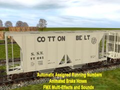 Accommodates CMTMSystem3 car destination system. Chicken Neck Foundry presents an animated 8 top hatch 2-Bay open side Covered Hopper with automatic assigned running numbers (thanks eldavo) and animated air brake hoses (thanks Wulf_9). The 8 top hatches open and close with load and unload sounds and dust flying at facilities like woodchips and interactive industries. Dust bellows from under the bays as the hopperunloads. Thanks bsnteng for fantastic assistance in editing hopper.gs script for automatic running numbers, brake air hoses, and couplers, and also thanks to Pencil42 aka Chris for fantastic assistance in editing previous hopper.gs script for the dust clouds at loading docks. . Thanks to Fitz505 for his prior assistance on hatch animation. Car has brake cylinders and couplers (thanks prjindigo) too. See more action and dust clouds loading at Auran industries. Created from the rails up with gmax Trainz Asset Creation Studio. Loads LARS and Auran products: barley, cement, corn, flour, grain hp, lose gravel, hops, limestone aggregate, malt, oats, peas, plaster, granular plastic, quartz sand, rice, sand, sand and gravel, soda ash, soya beans, sugar, taconite pellets, wheat, or woodchips. Employees cloakedghost275 bogies.