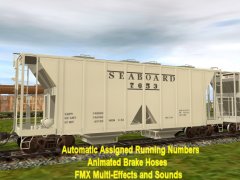 Accommodates CMTMSystem3 car destination system. Chicken Neck Foundry presents an animated 8 top hatch 2-Bay open side Covered Hopper with automatic assigned running numbers (thanks eldavo) and animated air brake hoses (thanks Wulf_9). The 8 top hatches open and close with load and unload sounds and dust flying at facilities like woodchips and interactive industries. Dust bellows from under the bays as the hopperunloads. Thanks bsnteng for fantastic assistance in editing hopper.gs script for automatic running numbers, brake air hoses, and couplers, and also thanks to Pencil42 aka Chris for fantastic assistance in editing previous hopper.gs script for the dust clouds at loading docks. . Thanks to Fitz505 for his prior assistance on hatch animation. Car has brake cylinders and couplers (thanks prjindigo) too. See more action and dust clouds loading at Auran industries. Created from the rails up with gmax Trainz Asset Creation Studio. Loads LARS and Auran products: barley, cement, corn, flour, grain hp, lose gravel, hops, limestone aggregate, malt, oats, peas, plaster, granular plastic, quartz sand, rice, sand, sand and gravel, soda ash, soya beans, sugar, taconite pellets, wheat, or woodchips. Employees cloakedghost275 bogies.