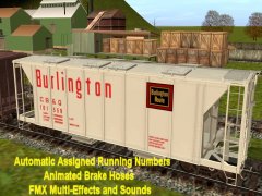 Accommodates CMTMSystem3 car destination system. Chicken Neck Foundry presents an animated 8 top hatch 2-Bay closed in side Covered Hopper with automatic assigned running numbers (thanks eldavo) and animated air brake hoses (thanks Wulf_9). The 8 top hatches open and close with load and unload sounds and dust flying at facilities like woodchips and interactive industries. Dust bellows from under the bays as the hopperunloads. Thanks bsnteng for fantastic assistance in editing hopper.gs script for automatic running numbers, brake air hoses, and couplers, and also thanks to Pencil42 aka Chris for fantastic assistance in editing previous hopper.gs script for the dust clouds at loading docks. . Thanks to Fitz505 for his prior assistance on hatch animation. Car has brake cylinders and couplers (thanks prjindigo) too. See more action and dust clouds loading at Auran industries. Created from the rails up with gmax Trainz Asset Creation Studio. Loads LARS and Auran products: barley, cement, corn, flour, grain hp, lose gravel, hops, limestone aggregate, malt, oats, peas, plaster, granular plastic, quartz sand, rice, sand, sand and gravel, soda ash, soya beans, sugar, taconite pellets, wheat, or woodchips. Employees cloakedghost275 bogies.