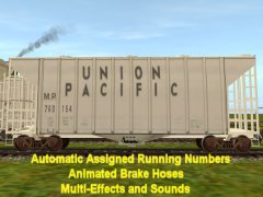 Chicken Neck Foundry presents a 2-bay airslide hopper. Looking more like a boxcar than a hopper, airslides where first introduced in 1954 by General American Transporation Corporation. They feature a finely perforated interior fabric lining. The powdered or granulated load of usually flour or sugar is effectively liquified as it is forced out of the car under high air pressure via hose connections. It is also used to carry grains and other fine products. This later 48 ft model hopper's top hatches open and close with load and unload sounds and additional dust clouds at facilities like woodchips and with automatic assigned running numbers (thanks eldavo) and animated air brake hoses (thanks Wulf_9).. While usually dust free, this car also bellows clouds of it from under the bays as the hopper unloads. Thanks to Pencil42, Fitz505 and PhilC (his handles and couplers), whose assistance on prior type hoppers and cars made this one possible. Car has brake cylinder and reservoir, and couplers too. Created from the rails up with gmax Trainz Asset Creation Studio. Loads LARS and Auran products: barley, cement, corn, flour, grain hp, lose gravel, hops, limestone aggregate, malt, oats, peas, plaster, granular plastic, quartz sand, rice, sand, sand and gravel, soda ash, soya beans, sugar, taconite pellets, wheat, or woodchips. Note: Some are not appropriate for this type car. Employees roller bearing trucks by CloakedGhost275.