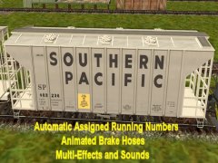 Chicken Neck Foundry presents a 2-bay airslide hopper. Looking more like a boxcar than a hopper, airslides where first introduced in 1954 by General American Transporation Corporation. They feature a finely perforated interior fabric lining. The powdered or granulated load of usually flour or sugar is effectively liquified as it is forced out of the car under high air pressure via hose connections. It is also used to carry grains and other fine products. This later 48 ft model hopper's top hatches open and close with load and unload sounds and additional dust clouds at facilities like woodchips and with automatic assigned running numbers (thanks eldavo) and animated air brake hoses (thanks Wulf_9).. While usually dust free, this car also bellows clouds of it from under the bays as the hopper unloads. Thanks to Pencil42, Fitz505 and PhilC (his handles and couplers), whose assistance on prior type hoppers and cars made this one possible. Car has brake cylinder and reservoir, and couplers too. Created from the rails up with gmax Trainz Asset Creation Studio. Loads LARS and Auran products: barley, cement, corn, flour, grain hp, lose gravel, hops, limestone aggregate, malt, oats, peas, plaster, granular plastic, quartz sand, rice, sand, sand and gravel, soda ash, soya beans, sugar, taconite pellets, wheat, or woodchips. Note: Some are not appropriate for this type car. Employees roller bearing trucks by CloakedGhost275.