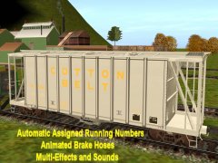 Chicken Neck Foundry presents a 2-bay airslide hopper. Looking more like a boxcar than a hopper, airslides where first introduced in 1954 by General American Transporation Corporation like this one. They feature a finely perforated interior fabric lining. The powdered or granulated load of usually flour or sugar is effectively liquified as it is forced out of the car under high air pressure via hose connections. It is also used to carry grains and other fine products. This early C111 39 ft model hopper's top hatches open and close with load and unload sounds and additional dust clouds at facilities like woodchips and with automatic assigned running numbers (thanks eldavo) and animated air brake hoses (thanks Wulf_9).. While usually dust free, this car also bellows clouds of it from under the bays as the hopper unloads. Thanks to Pencil42, Fitz505 and PhilC (his handles and couplers), whose assistance on prior type hoppers and cars made this one possible. Car has brake cylinder and reservoir, and couplers too. Created from the rails up with gmax Trainz Asset Creation Studio. Loads LARS and Auran products: barley, cement, corn, flour, grain hp, lose gravel, hops, limestone aggregate, malt, oats, peas,plaster, granular plastic, quartz sand, rice, sand, sand and gravel, soda ash, soya beans, sugar, taconite pellets, wheat, or woodchips. Note: Some are not appropriate for this type car. Employees roller bearing trucks by CloakedGhost275.