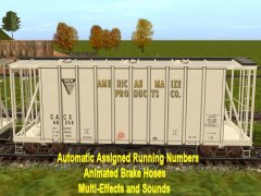 Chicken Neck Foundry presents a 2-bay airslide hopper. Looking more like a boxcar than a hopper, airslides where first introduced in 1954 by General American Transporation Corporation like this one. They feature a finely perforated interior fabric lining. The powdered or granulated load of usually flour or sugar is effectively liquified as it is forced out of the car under high air pressure via hose connections. It is also used to carry grains and other fine products. This early C111 39 ft model hopper's top hatches open and close with load and unload sounds and additional dust clouds at facilities like woodchips and with automatic assigned running numbers (thanks eldavo) and animated air brake hoses (thanks Wulf_9).. While usually dust free, this car also bellows clouds of it from under the bays as the hopper unloads. Thanks to Pencil42, Fitz505 and PhilC (his handles and couplers), whose assistance on prior type hoppers and cars made this one possible. Car has brake cylinder and reservoir, and couplers too. Created from the rails up with gmax Trainz Asset Creation Studio. Loads LARS and Auran products: barley, cement, corn, flour, grain hp, lose gravel, hops, limestone aggregate, malt, oats, peas,plaster, granular plastic, quartz sand, rice, sand, sand and gravel, soda ash, soya beans, sugar, taconite pellets, wheat, or woodchips. Note: Some are not appropriate for this type car. Employees roller bearing trucks by CloakedGhost275.