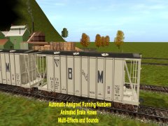 Chicken Neck Foundry presents a 2-bay airslide hopper. Looking more like a boxcar than a hopper, airslides where first introduced in 1954 by General American Transporation Corporation like this one. They feature a finely perforated interior fabric lining. The powdered or granulated load of usually flour or sugar is effectively liquified as it is forced out of the car under high air pressure via hose connections. It is also used to carry grains and other fine products. This early C111 39 ft model hopper's top hatches open and close with load and unload sounds and additional dust clouds at facilities like woodchips and with automatic assigned running numbers (thanks eldavo) and animated air brake hoses (thanks Wulf_9).. While usually dust free, this car also bellows clouds of it from under the bays as the hopper unloads. Thanks to Pencil42, Fitz505 and PhilC (his handles and couplers), whose assistance on prior type hoppers and cars made this one possible. Car has brake cylinder and reservoir, and couplers too. Created from the rails up with gmax Trainz Asset Creation Studio. Loads LARS and Auran products: barley, cement, corn, flour, grain hp, lose gravel, hops, limestone aggregate, malt, oats, peas,plaster, granular plastic, quartz sand, rice, sand, sand and gravel, soda ash, soya beans, sugar, taconite pellets, wheat, or woodchips. Note: Some are not appropriate for this type car. Employees roller bearing trucks by CloakedGhost275.