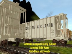 Chicken Neck Foundry presents a 2-bay airslide hopper. Looking more like a boxcar than a hopper, airslides where first introduced in 1954 by General American Transporation Corporation like this one. They feature a finely perforated interior fabric lining. The powdered or granulated load of usually flour or sugar is effectively liquified as it is forced out of the car under high air pressure via hose connections. It is also used to carry grains and other fine products. This early C111 39 ft model hopper's top hatches open and close with load and unload sounds and additional dust clouds at facilities like woodchips and with automatic assigned running numbers (thanks eldavo) and animated air brake hoses (thanks Wulf_9).. While usually dust free, this car also bellows clouds of it from under the bays as the hopper unloads. Thanks to Pencil42, Fitz505 and PhilC (his handles and couplers), whose assistance on prior type hoppers and cars made this one possible. Car has brake cylinder and reservoir, and couplers too. Created from the rails up with gmax Trainz Asset Creation Studio. Loads LARS and Auran products: barley, cement, corn, flour, grain hp, lose gravel, hops, limestone aggregate, malt, oats, peas,plaster, granular plastic, quartz sand, rice, sand, sand and gravel, soda ash, soya beans, sugar, taconite pellets, wheat, or woodchips. Note: Some are not appropriate for this type car. Employees roller bearing trucks by CloakedGhost275.