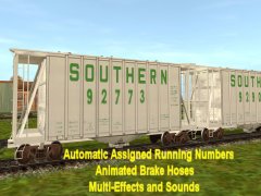 Chicken Neck Foundry presents a 2-bay airslide hopper. Looking more like a boxcar than a hopper, airslides where first introduced in 1954 by General American Transporation Corporation like this one. They feature a finely perforated interior fabric lining. The powdered or granulated load of usually flour or sugar is effectively liquified as it is forced out of the car under high air pressure via hose connections. It is also used to carry grains and other fine products. This early C111 39 ft model hopper's top hatches open and close with load and unload sounds and additional dust clouds at facilities like woodchips and with automatic assigned running numbers (thanks eldavo) and animated air brake hoses (thanks Wulf_9).. While usually dust free, this car also bellows clouds of it from under the bays as the hopper unloads. Thanks to Pencil42, Fitz505 and PhilC (his handles and couplers), whose assistance on prior type hoppers and cars made this one possible. Car has brake cylinder and reservoir, and couplers too. Created from the rails up with gmax Trainz Asset Creation Studio. Loads LARS and Auran products: barley, cement, corn, flour, grain hp, lose gravel, hops, limestone aggregate, malt, oats, peas,plaster, granular plastic, quartz sand, rice, sand, sand and gravel, soda ash, soya beans, sugar, taconite pellets, wheat, or woodchips. Note: Some are not appropriate for this type car. Employees roller bearing trucks by CloakedGhost275.