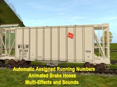 Chicken Neck Foundry presents a 2-bay airslide hopper. Looking more like a boxcar than a hopper, airslides where first introduced in 1954 by General American Transporation Corporation like this one. They feature a finely perforated interior fabric lining. The powdered or granulated load of usually flour or sugar is effectively liquified as it is forced out of the car under high air pressure via hose connections. It is also used to carry grains and other fine products. This early C111 39 ft model hopper's top hatches open and close with load and unload sounds and additional dust clouds at facilities like woodchips and with automatic assigned running numbers (thanks eldavo) and animated air brake hoses (thanks Wulf_9).. While usually dust free, this car also bellows clouds of it from under the bays as the hopper unloads. Thanks to Pencil42, Fitz505 and PhilC (his handles and couplers), whose assistance on prior type hoppers and cars made this one possible. Car has brake cylinder and reservoir, and couplers too. Created from the rails up with gmax Trainz Asset Creation Studio. Loads LARS and Auran products: barley, cement, corn, flour, grain hp, lose gravel, hops, limestone aggregate, malt, oats, peas,plaster, granular plastic, quartz sand, rice, sand, sand and gravel, soda ash, soya beans, sugar, taconite pellets, wheat, or woodchips. Note: Some are not appropriate for this type car. Employees roller bearing trucks by CloakedGhost275.