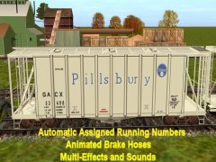 Chicken Neck Foundry presents a 2-bay airslide hopper. Looking more like a boxcar than a hopper, airslides where first introduced in 1954 by General American Transporation Corporation like this one. They feature a finely perforated interior fabric lining. The powdered or granulated load of usually flour or sugar is effectively liquified as it is forced out of the car under high air pressure via hose connections. It is also used to carry grains and other fine products. This early C111 39 ft model hopper's top hatches open and close with load and unload sounds and additional dust clouds at facilities like woodchips and with automatic assigned running numbers (thanks eldavo) and animated air brake hoses (thanks Wulf_9).. While usually dust free, this car also bellows clouds of it from under the bays as the hopper unloads. Thanks to Pencil42, Fitz505 and PhilC (his handles and couplers), whose assistance on prior type hoppers and cars made this one possible. Car has brake cylinder and reservoir, and couplers too. Created from the rails up with gmax Trainz Asset Creation Studio. Loads LARS and Auran products: barley, cement, corn, flour, grain hp, lose gravel, hops, limestone aggregate, malt, oats, peas,plaster, granular plastic, quartz sand, rice, sand, sand and gravel, soda ash, soya beans, sugar, taconite pellets, wheat, or woodchips. Note: Some are not appropriate for this type car. Employees roller bearing trucks by CloakedGhost275.