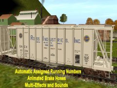 Chicken Neck Foundry presents a 2-bay airslide hopper. Looking more like a boxcar than a hopper, airslides where first introduced in 1954 by General American Transporation Corporation like this one. They feature a finely perforated interior fabric lining. The powdered or granulated load of usually flour or sugar is effectively liquified as it is forced out of the car under high air pressure via hose connections. It is also used to carry grains and other fine products. This early C111 39 ft model hopper's top hatches open and close with load and unload sounds and additional dust clouds at facilities like woodchips and with automatic assigned running numbers (thanks eldavo) and animated air brake hoses (thanks Wulf_9).. While usually dust free, this car also bellows clouds of it from under the bays as the hopper unloads. Thanks to Pencil42, Fitz505 and PhilC (his handles and couplers), whose assistance on prior type hoppers and cars made this one possible. Car has brake cylinder and reservoir, and couplers too. Created from the rails up with gmax Trainz Asset Creation Studio. Loads LARS and Auran products: barley, cement, corn, flour, grain hp, lose gravel, hops, limestone aggregate, malt, oats, peas,plaster, granular plastic, quartz sand, rice, sand, sand and gravel, soda ash, soya beans, sugar, taconite pellets, wheat, or woodchips. Note: Some are not appropriate for this type car. Employees roller bearing trucks by CloakedGhost275.