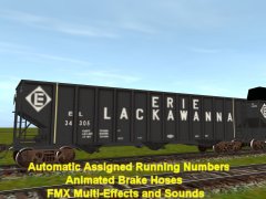 H43 3-bay bottom dump hopper (XHB) 100 ton 45 foot with Automatic Assigned Running Numbers, animated brake hoses, and MFX multi-effect with smoke and sounds, and also ccommodates CMTMSystem3 car destination system. Many thanks to emcnally for assistance and permissions granted. Special thanks to bsnteng for FMX library v1.09. Thanks also to Eldavo and Wulf_9 for their significate contributions, and other dependencies by llj, cloakedghost275, genesteal, jsibm, jimm, slugmasher, zatovisualworks, whitepass and winnaa. Reskinned by majekear. The Norfolk and Western Railroad created the H-11 class which is an enlarged PRR H-39 of 70 ton hopper. The size was increased in 1964 to 12 feet 3 inches high with an increase in cubic feet to 3433 At 45 feet in length the weight capacity went up to 90-100 tons. Thus the H43 was created and eventually 130,00 would be built.