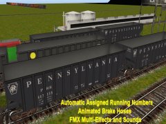 H43 3-bay bottom dump hopper (XHB) 100 ton 45 foot with Automatic Assigned Running Numbers, animated brake hoses, and MFX multi-effect with smoke and sounds, and also ccommodates CMTMSystem3 car destination system. Many thanks to emcnally for assistance and permissions granted. Special thanks to bsnteng for FMX library v1.09. Thanks also to Eldavo and Wulf_9 for their significate contributions, and other dependencies by llj, cloakedghost275, genesteal, jsibm, jimm, slugmasher, zatovisualworks, whitepass and winnaa. Reskinned by majekear. The Norfolk and Western Railroad created the H-11 class which is an enlarged PRR H-39 of 70 ton hopper. The size was increased in 1964 to 12 feet 3 inches high with an increase in cubic feet to 3433 At 45 feet in length the weight capacity went up to 90-100 tons. Thus the H43 was created and eventually 130,00 would be built.