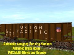 H43 3-bay bottom dump hopper (XHB) 100 ton 45 foot with Automatic Assigned Running Numbers, animated brake hoses, and MFX multi-effect with smoke and sounds, and also ccommodates CMTMSystem3 car destination system. Many thanks to emcnally for assistance and permissions granted. Special thanks to bsnteng for FMX library v1.09. Thanks also to Eldavo and Wulf_9 for their significate contributions, and other dependencies by llj, cloakedghost275, genesteal, jsibm, jimm, slugmasher, zatovisualworks, whitepass and winnaa. Reskinned by majekear. The Norfolk and Western Railroad created the H-11 class which is an enlarged PRR H-39 of 70 ton hopper. The size was increased in 1964 to 12 feet 3 inches high with an increase in cubic feet to 3433 At 45 feet in length the weight capacity went up to 90-100 tons. Thus the H43 was created and eventually 130,00 would be built.