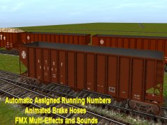 H43 3-bay bottom dump hopper (XHB) 100 ton 45 foot with Automatic Assigned Running Numbers, animated brake hoses, and MFX multi-effect with smoke and sounds, and also ccommodates CMTMSystem3 car destination system. Many thanks to emcnally for assistance and permissions granted. Special thanks to bsnteng for FMX library v1.09. Thanks also to Eldavo and Wulf_9 for their significate contributions, and other dependencies by llj, cloakedghost275, genesteal, jsibm, jimm, slugmasher, zatovisualworks, whitepass and winnaa. Reskinned by majekear. The Norfolk and Western Railroad created the H-11 class which is an enlarged PRR H-39 of 70 ton hopper. The size was increased in 1964 to 12 feet 3 inches high with an increase in cubic feet to 3433 At 45 feet in length the weight capacity went up to 90-100 tons. Thus the H43 was created and eventually 130,00 would be built.