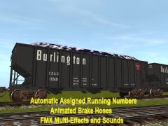 H43 3-bay bottom dump hopper (XHB) 100 ton 45 foot with Automatic Assigned Running Numbers, animated brake hoses, and MFX multi-effect with smoke and sounds, and also ccommodates CMTMSystem3 car destination system. Many thanks to emcnally for assistance and permissions granted. Special thanks to bsnteng for FMX library v1.09. Thanks also to Eldavo and Wulf_9 for their significate contributions, and other dependencies by llj, cloakedghost275, genesteal, jsibm, jimm, slugmasher, zatovisualworks, whitepass and winnaa. Reskinned by majekear. The Norfolk and Western Railroad created the H-11 class which is an enlarged PRR H-39 of 70 ton hopper. The size was increased in 1964 to 12 feet 3 inches high with an increase in cubic feet to 3433 At 45 feet in length the weight capacity went up to 90-100 tons. Thus the H43 was created and eventually 130,00 would be built.