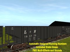 H43 3-bay bottom dump hopper (XHB) 100 ton 45 foot with Automatic Assigned Running Numbers, animated brake hoses, and MFX multi-effect with smoke and sounds, and also ccommodates CMTMSystem3 car destination system. Many thanks to emcnally for assistance and permissions granted. Special thanks to bsnteng for FMX library v1.09. Thanks also to Eldavo and Wulf_9 for their significate contributions, and other dependencies by llj, cloakedghost275, genesteal, jsibm, jimm, slugmasher, zatovisualworks, whitepass and winnaa. Reskinned by majekear. The Norfolk and Western Railroad created the H-11 class which is an enlarged PRR H-39 of 70 ton hopper. The size was increased in 1964 to 12 feet 3 inches high with an increase in cubic feet to 3433 At 45 feet in length the weight capacity went up to 90-100 tons. Thus the H43 was created and eventually 130,00 would be built.