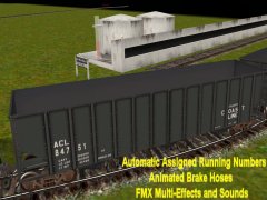 H43 3-bay bottom dump hopper (XHB) 100 ton 45 foot with Automatic Assigned Running Numbers, animated brake hoses, and MFX multi-effect with smoke and sounds, and also ccommodates CMTMSystem3 car destination system. Many thanks to emcnally for assistance and permissions granted. Special thanks to bsnteng for FMX library v1.09. Thanks also to Eldavo and Wulf_9 for their significate contributions, and other dependencies by llj, cloakedghost275, genesteal, jsibm, jimm, slugmasher, zatovisualworks, whitepass and winnaa. Reskinned by majekear. The Norfolk and Western Railroad created the H-11 class which is an enlarged PRR H-39 of 70 ton hopper. The size was increased in 1964 to 12 feet 3 inches high with an increase in cubic feet to 3433 At 45 feet in length the weight capacity went up to 90-100 tons. Thus the H43 was created and eventually 130,00 would be built.