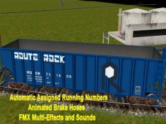 H43 3-bay bottom dump hopper (XHB) 100 ton 45 foot with Automatic Assigned Running Numbers, animated brake hoses, and MFX multi-effect with smoke and sounds, and also ccommodates CMTMSystem3 car destination system. Many thanks to emcnally for assistance and permissions granted. Special thanks to bsnteng for FMX library v1.09. Thanks also to Eldavo and Wulf_9 for their significate contributions, and other dependencies by llj, cloakedghost275, genesteal, jsibm, jimm, slugmasher, zatovisualworks, whitepass and winnaa. Reskinned by majekear. The Norfolk and Western Railroad created the H-11 class which is an enlarged PRR H-39 of 70 ton hopper. The size was increased in 1964 to 12 feet 3 inches high with an increase in cubic feet to 3433 At 45 feet in length the weight capacity went up to 90-100 tons. Thus the H43 was created and eventually 130,00 would be built.