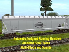 This Centerflow has automatic assigned running numbers, animated brake air hoses, and accommodates the CMTMSystem3 car destination system. Watch as the hatches open while dust and smoke bellows out the top as this centerflow car as it loads. Dust bellows from under the bays as the hopper unloads. Many thanks Fitz505 aka John whose icehatch opening boxcars and assistance made the hatch animation possible. And to Pencil42 aka Chris for fantastic assistance in editing the hopper.gs script for the dust clouds. Car has brake cylinders, couplers, and animated brake hoses too. More action and dust clouds loading at Auran industries. Created with gmax Trainz Asset Creation Studio. Loads LARS and Auran products: barley, cement, corn, flour, grain hp, lose gravel, hops, limestone aggregate, malt, oats, peas, plaster, granular plastic, quartz sand, rice, sand, sand and gravel, salt, soda ash, soya beans, sugar, taconite pellets, wheat, or woodchips.