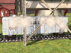 Chicken Neck Foundry presents a 2-bay airslide hopper. Looking more like a boxcar than a hopper, airslides where first introduced in 1954 by General American Transporation Corporation. They feature a finely perforated interior fabric lining. The powdered or granulated load of usually flour or sugar is effectively liquified as it is forced out of the car under high air pressure via hose connections. It is also used to carry grains and other fine products. This later 48 ft model hopper's top hatches open and close with load and unload sounds and additional dust clouds at facilities like woodchips and with automatic assigned running numbers (thanks eldavo) and animated air brake hoses (thanks Wulf_9).. While usually dust free, this car also bellows clouds of it from under the bays as the hopper unloads. Thanks to Pencil42, Fitz505 and PhilC (his handles and couplers), whose assistance on prior type hoppers and cars made this one possible. Car has brake cylinder and reservoir, and couplers too. Created from the rails up with gmax Trainz Asset Creation Studio. Loads LARS and Auran products: barley, cement, corn, flour, grain hp, lose gravel, hops, limestone aggregate, malt, oats, peas, plaster, granular plastic, quartz sand, rice, sand, sand and gravel, soda ash, soya beans, sugar, taconite pellets, wheat, or woodchips. Note: Some are not appropriate for this type car. Employees roller bearing trucks by CloakedGhost275.