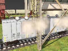 Chicken Neck Foundry presents a 2-bay airslide hopper. Looking more like a boxcar than a hopper, airslides where first introduced in 1954 by General American Transporation Corporation. They feature a finely perforated interior fabric lining. The powdered or granulated load of usually flour or sugar is effectively liquified as it is forced out of the car under high air pressure via hose connections. It is also used to carry grains and other fine products. This later 48 ft model hopper's top hatches open and close with load and unload sounds and additional dust clouds at facilities like woodchips and with automatic assigned running numbers (thanks eldavo) and animated air brake hoses (thanks Wulf_9).. While usually dust free, this car also bellows clouds of it from under the bays as the hopper unloads. Thanks to Pencil42, Fitz505 and PhilC (his handles and couplers), whose assistance on prior type hoppers and cars made this one possible. Car has brake cylinder and reservoir, and couplers too. Created from the rails up with gmax Trainz Asset Creation Studio. Loads LARS and Auran products: barley, cement, corn, flour, grain hp, lose gravel, hops, limestone aggregate, malt, oats, peas, plaster, granular plastic, quartz sand, rice, sand, sand and gravel, soda ash, soya beans, sugar, taconite pellets, wheat, or woodchips. Note: Some are not appropriate for this type car. Employees roller bearing trucks by CloakedGhost275.