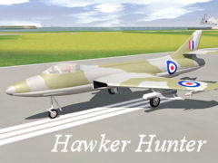 A Hawker Hunter aircraft, startup model. It operates on invisible track. It is set up for carrier operations.