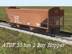 An ATSF 2 bay 55 ton hopper car, configured to load ore, minerals, ballast, gravel or coal, empty.