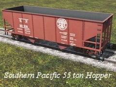 A Southern Pacific 2 bay 55 ton hopper car, configured to load ore, minerals, gravel, ballast or coal, empty.