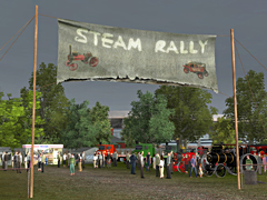 A faded old canvas banner advertising a rally for steam-power enthusiasts.