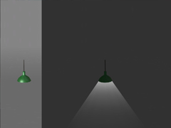 An overhead platform lamp suspended on a 0.3m (1ft) electrical cord. The lamp casts a conical gradient of white light in nightmode. There is no fixed ground plane of light included, but suitable nightmode light pools (such as kuids 68213 21078 to 21094) can be placed independently below it.