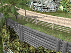 It is a 4m-high retaining wall of light grey weathered logs with endcap walls and a ground plane matching my Grass 02 DR groundtexture. The repeating unit is 10m long and LOD polycounts are 282, 190, 78, 6 triangles and 2 materials per unit. Made in 3DS Max 2009.