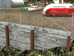 It is a timber retaining wall with a ground plane on top matching my Gravel 01 DR groundtexture and supported by rusty steel I-beams. Repeating sections are 4m long, LOD polycounts are 42, 24, 6 triangles, culled at a nominal 4000m. 2 materials per mesh. Made for Michael Sutton (sirgibby) in 3DS Max 2009.